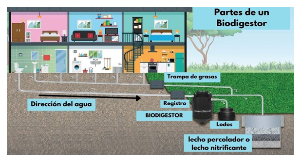El biodigestor es parte de un sistema de tratamiento de líquidos cloacales que se complementa con una cámara séptica y un punto de vuelco que puede ser un pozo absorbente o un túnel de infiltración. En el caso de las aguas grises (aquellas provenientes de las bachas y duchas) las mismas pasan por una cámara desengrasadora y de allí directamente al punto de vuelco sin pasar por el biodigestor.
