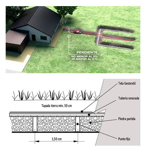 Se colocan rodeados de grava, se cierran con un manto de Tela Geotextil / Nylon de 200 micrones y tierra compactada.